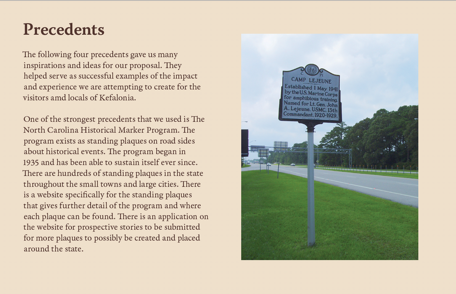 Our final proposal was a scattered exhibit around the capital city of Argostoli that consisted of monuments titled by the different archetypes and stories we developed from direct accounts of Kefalonian citizens in our interviews. We wanted to focus on storytelling as a means of communicating history because of the emotional and lasting impact these stories demand of their readers. We intended on turning the city into an exhibit itself by randomly placing these monuments in the hopes that visitors and locals would stumble upon them, take a moment to interact with it, reflect, and then go about the rest of their day without having to take the time to visit a standing museum.